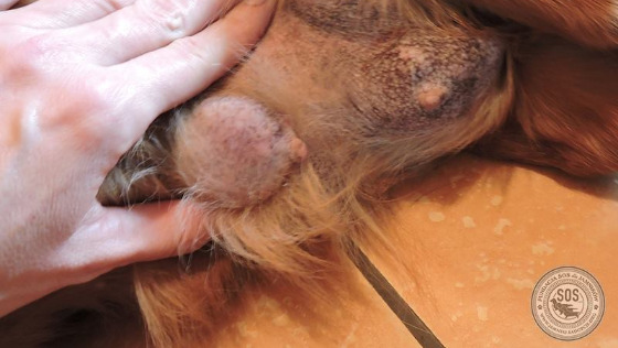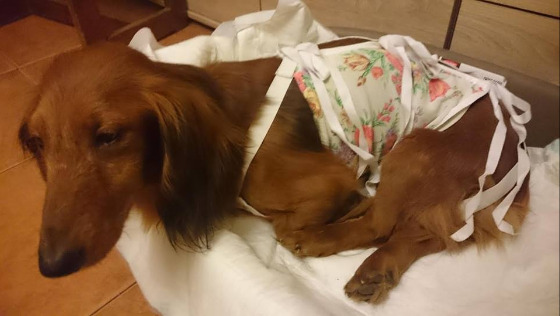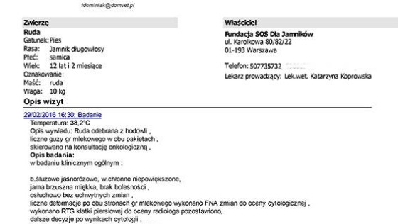 Operacja Rudej zaczęła się o 14- tak, jak ustaliliśmy z Panem Doktorem. Ruda została jeszcze zbadana, potem premedykacja i Pan Doktor kazał nam wyjść. Podczas oczekiwania na Rudą lataliśmy po mieście w poszukiwaniu formaliny, bo nie uprzedziliśmy wcześniej, że guzy będą jechały na badanie histopatologiczne. O 15.20 Ruda już wybudzona czekała na nas w lecznicy. Pan Doktor podarował Rudej śliczny kubrak, specjalny dla jamniorów. Wszystko, co zostało wycięte z Rudej mogliśmy obejrzeć, zdjęć tej wątpliwej przyjemności nie ma. Prawa listwa mleczna została usunięta.