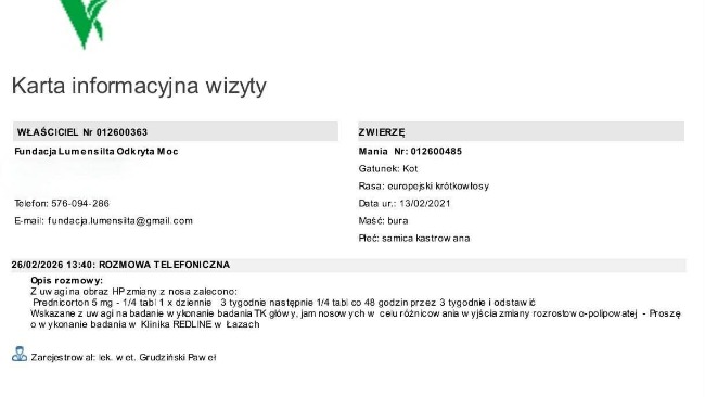 W nawiązaniu do wcześniejszej zbiórki chcemy poinformować, że u Mani została już wykonana endoskopia oraz zabieg usunięcia polipa z nosogardzieli. Było to konieczne, aby pomóc jej swobodniej oddychać i sprawdzić przyczynę problemów zdrowotnych. Zabieg oraz dotychczasowa diagnostyka zostały przez nas opłacone, jednak poprzednia zbiórka niestety nie osiągnęła swojego celu i część kosztów musieliśmy pokryć z prywatnych środków.