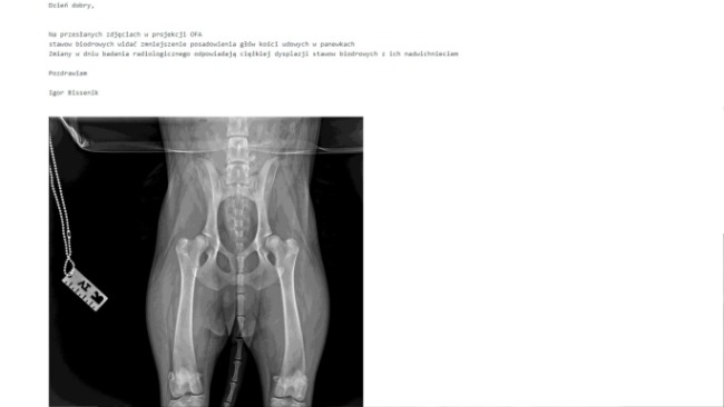 Karelski pies na niedźwiedzie to rasa pierwotna, dla której podstawą jest aktywność ruchowa. Choroba uniemożliwia bieganie Furii, powoduje niesprawność tylnych łap i ból. Przeniesienie całego ciężaru na przednie łapy doprowadziło do utworzenia przerostów na przednich kończynach. Pies aktualnie przyjmuje środki przeciwbólowe.