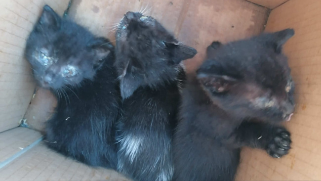 Kolejne maleństwa wystawione w kartonie. Cudem udało się je połapać zaskoczonemu znalazcy – wystraszone kuleczki biegły przed siebie nie patrząc na niebezpieczeństwa.
