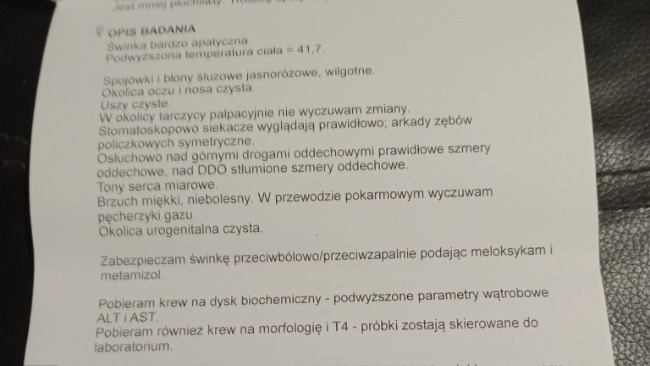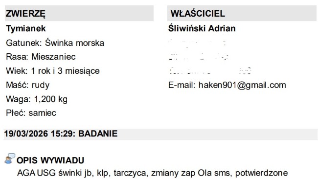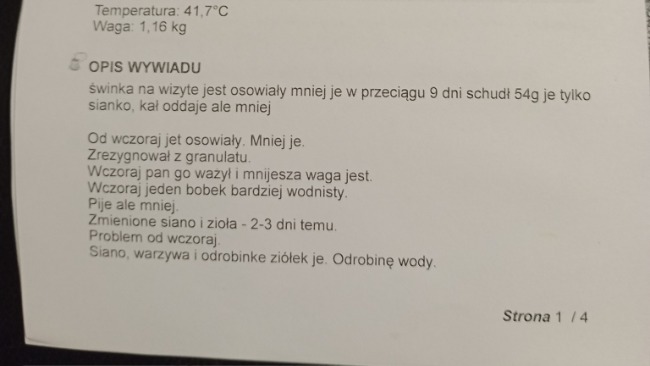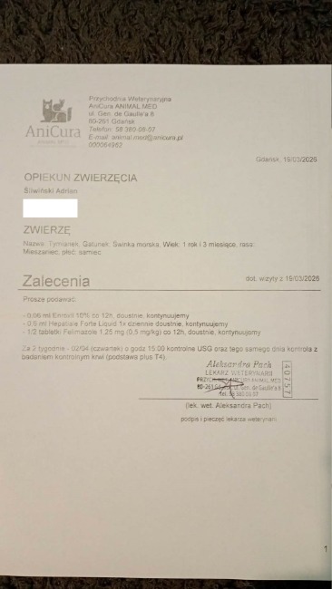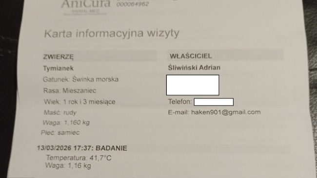 Nie ukrywam, że jestem zasmucony - bardzo liczyłem na to, że USG wyjdzie ok. Jest jednak też jaśniejsza strona tej sytuacji. Tymianek na co dzień zachowuje się jak pełna energii, radosna świnka, ma apetyt i chęć do życia. Co więcej, od poniedziałku przybrał aż 40 gramów, co jest naprawdę dobrym sygnałem. Wciąż jest nadzieja, że wykryte zmiany mają związek ze stanem zapalnym, np. przebytym lub trwającym zapaleniem płuc, i że na kolejnym badaniu kontrolnym okaże się, że wszystko wraca do normy.