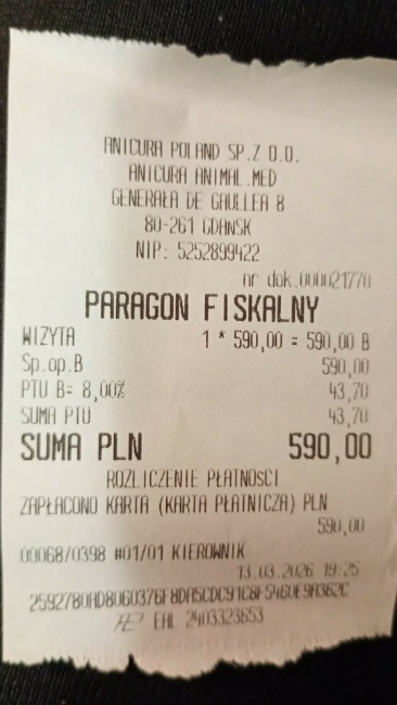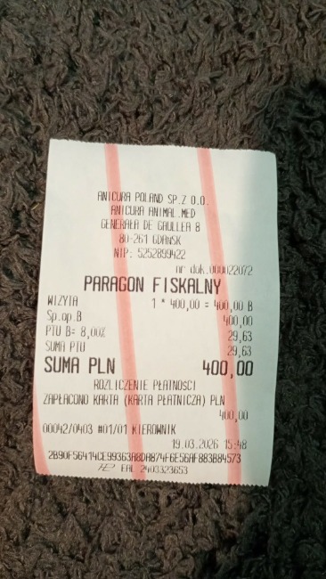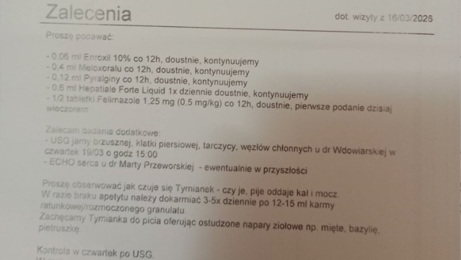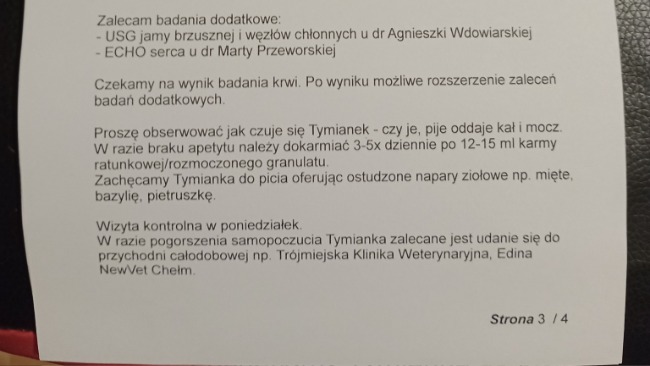 Tymianek otrzymał kroplówkę oraz leki, które muszę mu teraz codziennie podawać. W poniedziałek czeka nas wizyta kontrolna, a prawdopodobnie także kolejne, kosztowne badania – między innymi USG i echo serca, które mogą pomóc ustalić przyczynę jego problemów zdrowotnych. Niestety, jak powiedziała pani doktor, przypadek Tymianka jest nietypowy i na tym etapie trudno jeszcze postawić jednoznaczną diagnozę.