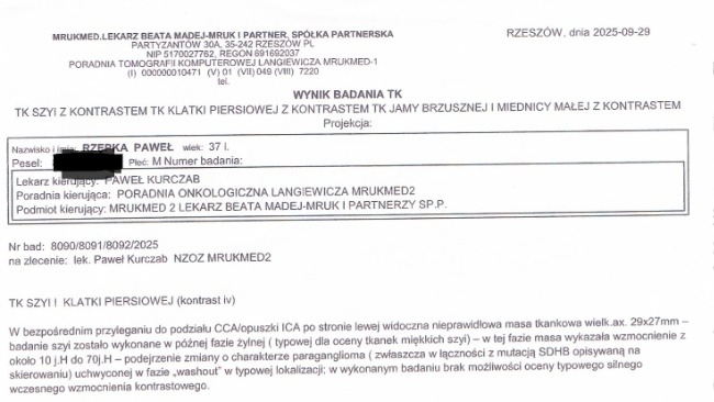 - PRZYZWOJAK (PARAGANGLIOMA). Wyniki tomografii komputerowej z Października 2025 nie pozostawiają złudzeń: masa o wymiarach 3cm x 3 cm nacieka na podział tętnicy szyjnej, wtedy guz był jeszcze nie widoczny, dziś czyli Luty 2026 jest wyraźnie widoczny ( Wybrzuszony ) na szyi. Guz jest hormonalnie czynny
