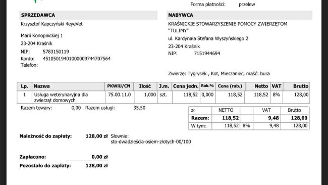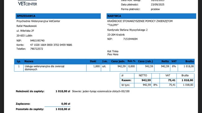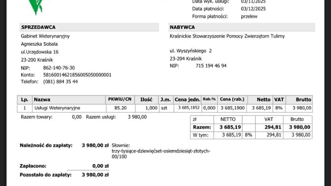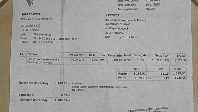 Zbiórka założona na potrzeby opłacenia faktur weterynaryjnych za opiekę, leczenie, badania i zabiegi