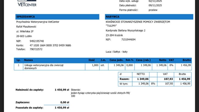 Dodatkowo różne zabiegi/operacje ratujące życie jak np. ostatnio amputacja łapki u kota, ucha, kroplówki, leki.