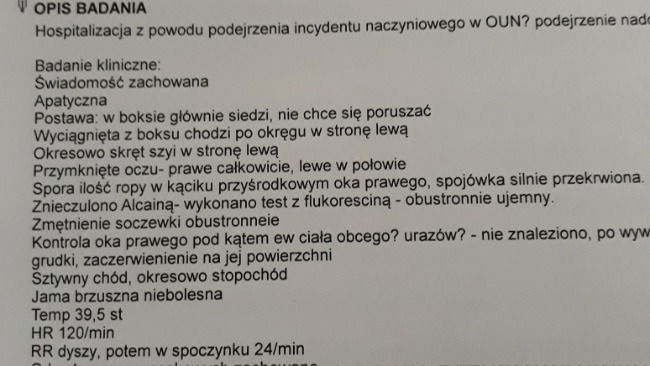 Mamy wypis z Amwet. Sasza powinna odwiedzić neurologa i okulistę. Najprawdopodobniej miała udar.