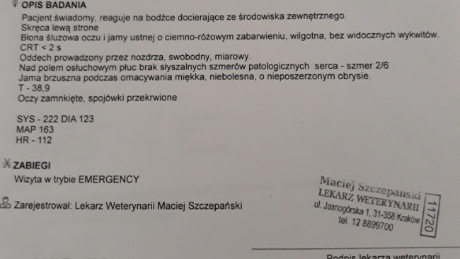 Sasza znów trafiła w nocy do gabinetu całodobowego AMWET na Jasnogórskiej. Nie mogła oddychać. Górne ciśnienie krwi wykazało 220, gdzie norma to 120.