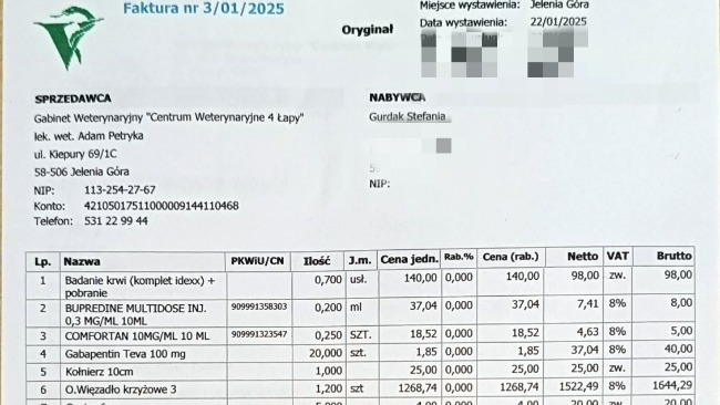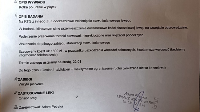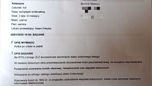 Kasiula, nasza pełna energi i miłości kotka w piątek 17.01 jak zwykle dokazywała po naszym powrocie do domu. Zawsze jest jej wszędzie pełno, włazi tam gdzie się tylko zmieści i anektuje kolejną przestrzeń. Jak zwykle, podczas przygotowywania posiłku dla swojego najmłodszego ludzkiego braciszka, musiała obserwować czy oby nie dostaje za dużo smaczków. Kiedy odeszłam od blatu z dzieckiem na ręku, kaśka najprawdopodobniej przestraszyła się pary z miski i zeskoczyła z blatu, z którego skakała kilkanaście razy dziennie, codziennie. Ale tym razem coś w jej kocim fachu poszło bardzo nie tak. Był jeden wielki popłoch i wrzask, nie wiedziałam że kot może tak bardzo płakać z bólu. Nie wiedzieliśmy co się stało, na początku może że się poparzyła parą, i tak też powiedzieliśmy weterynarzowi, ale okazało się zupełnie coś innego. Zdjęcie RTG wykazało zerwanie wiązadeł stawowych. Z racji że nigdy nie podejrzewaliśmy że kot może mieć taki uraz, nie wiedzieliśmy również z jakimi kosztami wiąże się leczenie. I tu szok... Może dla kogoś 1800 zł to nie jest dużo ale dla nas to kwota chwilowo nie do osiągnięcia. Nowy rok przywitał nas niespodziewanymi kosztami za wynajem mieszkania, i dlatego musimy prosić o pomoc naszych zwierzolubnych przyjaciół. Sami jak mamy to pomagamy, teraz to my potrzebujemy waszej pomocy z opłaceniem kosztów operacji naszej Kasi. Weterynarz wycenił wstępnie operację na kwotę 1800 zł co może się zmienić w trakcie jej trwania. Dlatego bardzo prosimy i z góry dziękujemy za każdą wpłatę i udostępnienie