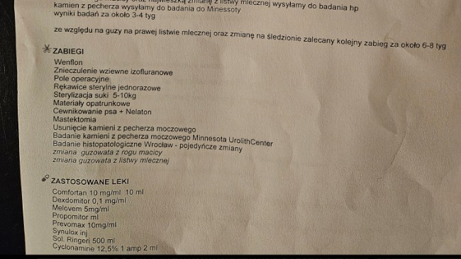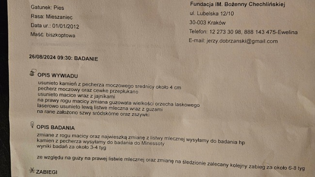 Całą diagnostykę i operację, wykonali lekarze z gabinetu Dobry Weterynarz w Myślenicach. Sunia jest już wysterylizowana, lewa listwa mleczna usunięta, kamień z pęcherza usunięty.