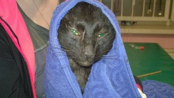 Poza tym Klakier to kochany, miziasty kocurek. Podczas badań ból i strach spowodowały, że kocurek bardzo się wyrywał, dlatego przez niemal całą wizytę był ofulony ręcznikiem i głaskany przez opiekunów.