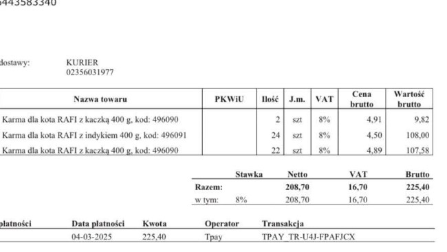 Każdego dnia koty zjadają ponad 5 kg wysokomięsnej mokrej karmy, czyli 13 puszek po 400 gram. Jedna puszka kosztuje w granicach 5 zł. Chcemy zapewnić naszym podopiecznym jedzenie na marzec 2025 r, dlatego uruchomiliśmy zbiórkę, która pokryje ten wydatek.