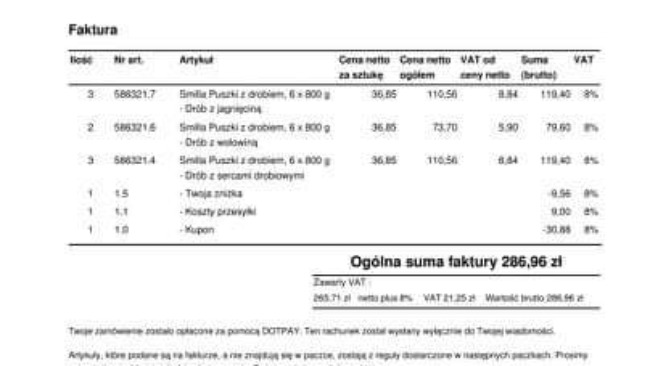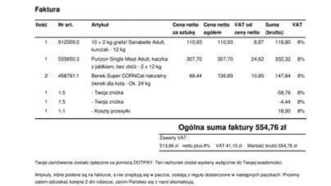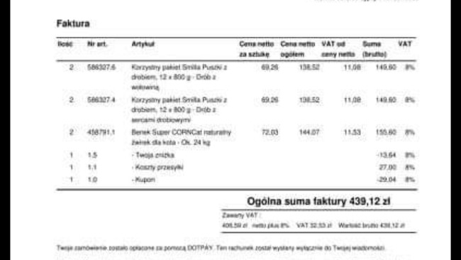 Poniżej zamieszczam screeny faktur za jedzenie i żwirek...
