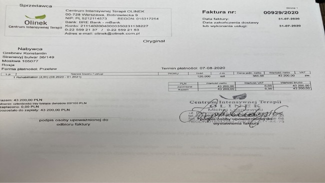 Wielkie dzięki za pomoc. Oto faktura za leczenie 7095 zl.