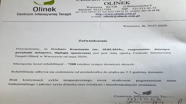 Teraz Konstanty ma pięć lata. Przez ten czas nauczył się chodzić na czworakach. Komunikuje się z nami w swoim języku. Uczy się prostych gestów. Wszystko rozumie. Lubi, kiedy ktoś czyta mu bajki. Niestety nadal nie chodzi i nie siedzi… Każdy nasz nowy dzień to walka z chorobą. Aby ją pokonać, postanowiliśmy udać się na leczenie w polskich ośrodkach, ponieważ w nich rehabilitacja odbywa się kompleksowo. Lekarze pracują z zaburzeniami ruchu, z sferą intelektualną i z integrowaniem pracy zmysłów. W Rosji nie ma takiego kompleksowego podejścia do rehabilitacji dzieci. Niestety cena rehabilitacji w Polsce jest dla nas nie do udźwignięcia.