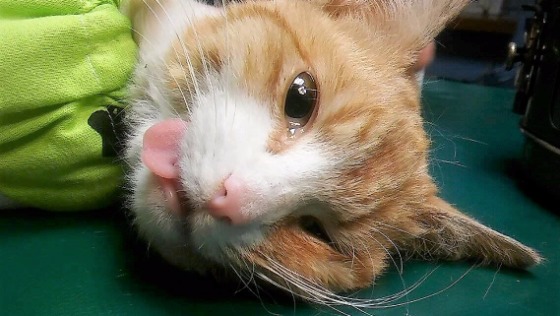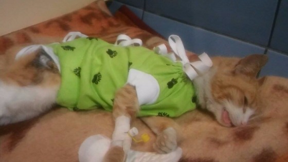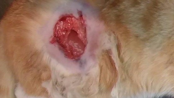 Odnowiono brzegi rany, oczyszczono, zszyto. Kotka jest bardzo słabiutka i pozostaje pod opieką weterynarzy.