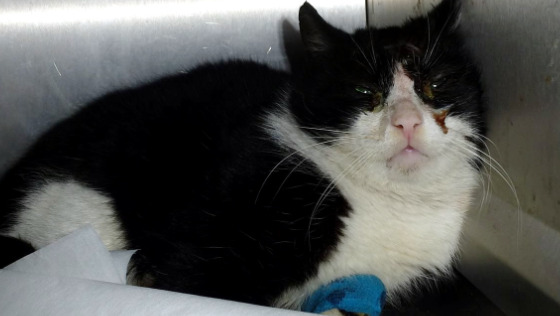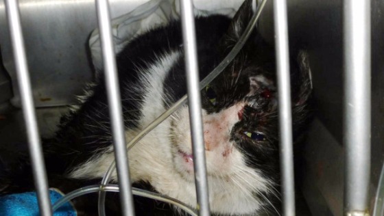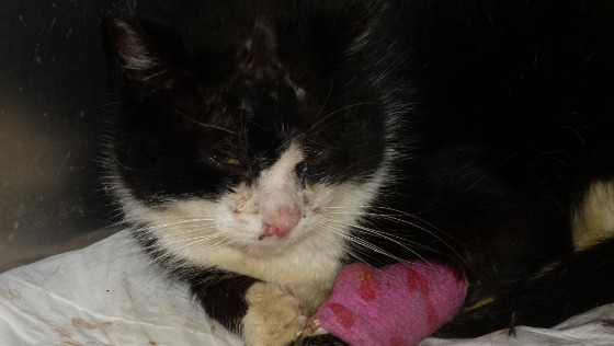 ... na szczęście kierowca nie odjechał z piskiem opon. Zabrał kota do lecznicy. Tam rozpoczęto intensywne leczenie. Zrobiono rtg, usg. Stwierdzono obrzęk mózgu, rana na głowie mocno krwawiła. Kocurek miał też problem z łapką, na której nie stawał.