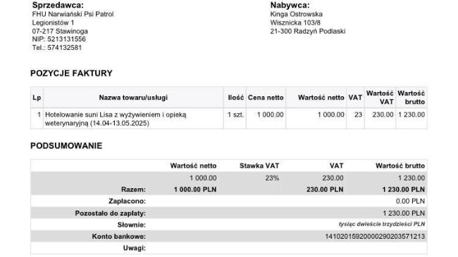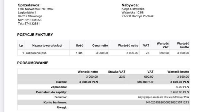 Jestem zobowiązana zwrócić koszty kilku przyjazdów do Radzynia i prób łapanki ( na ten moment 5 przyjazdów i piec prób odłowienia plus kolejna planowana łapanka - wstępnie 3000zl netto plus VAT ) z wykorzystaniem specjalnych środków i fachowego sprzętu a także koszty związane z opłata hoteliku.