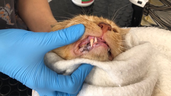Niestety już na pierwszy rzut oka było widać, że pyszczek Krokiecika potrzebuje pilnej pomocy 🐾 Ząbki były w złym stanie, dlatego oprócz kastracji wykonaliśmy sanację jamy ustnej. Zabieg przebiegł bez komplikacji, ale pod językiem znaleziono niepokojącą zmianę — pobraliśmy więc wycinek do badania histopatologicznego. Równolegle zrobiliśmy USG płuc, ponieważ karmiciel zgłaszał, że kot miewa problemy oddechowe 💨