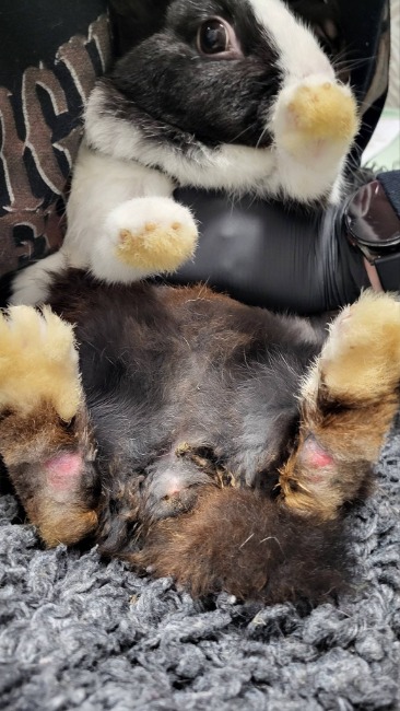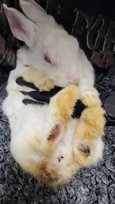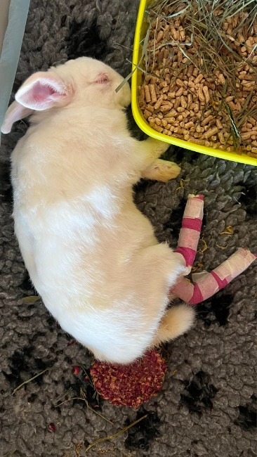 Jeden z królików został zaopatrzony w specjalne opatrunki na łapki. Otrzymał leki przeciwbólowe i miękkie posłanie. Zobaczcie jak "niewiele" wystarczyło, by poczuł się bezpiecznie.