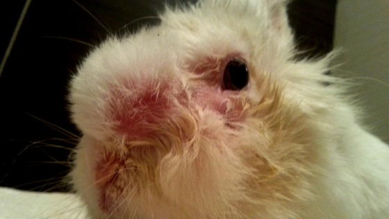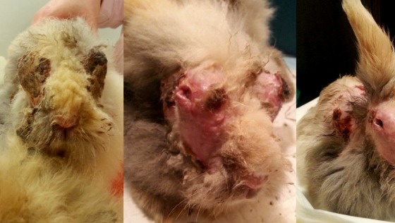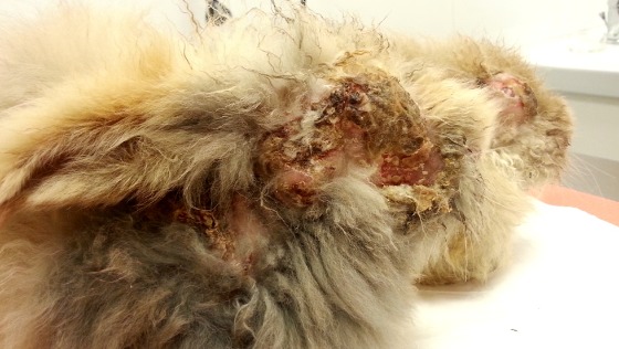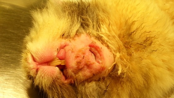 Na łapkach odparzenia od ropy. Ropa wszędzie- w nosie, w pyszczku, na pyszczku, na uszach, na głowie, na szyi, na łapkach. Warstwa ropy uniemożliwiała mu nawet normalne zamykanie oka.