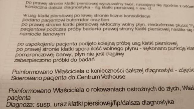 Wczoraj miał słabszy apetyt a dzisiaj rano drastycznie zaczęła mu spadać temperatura, poniżej 36 stopni. Natychmiast pojechał do lecznicy gdzie został poddany wstępnej diagnostyce, jednak ponieważ zaczął się u niego zbierać płyn w klatce piersiowej nieznanego pochodzenia i wystąpiła silna duszność musiałam go przewieźć na sygnale do lecznicy całodobowej. Tam trwa dalsza diagnostyka, zostało wykonane rtg, usg, zbadana krew ale nadal nie mamy przyczyny jego ciężkiego stanu.