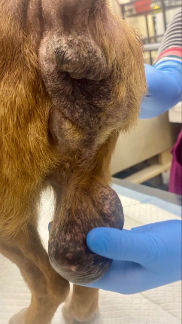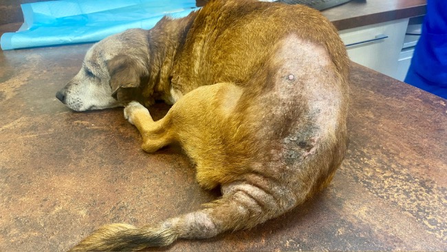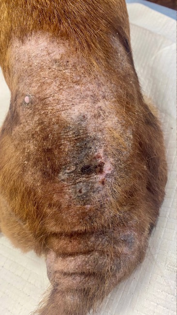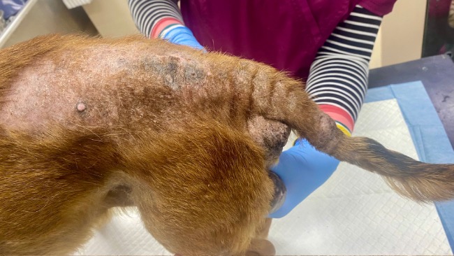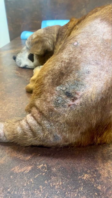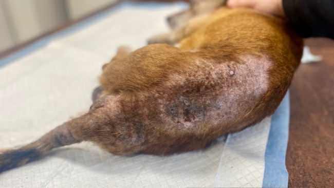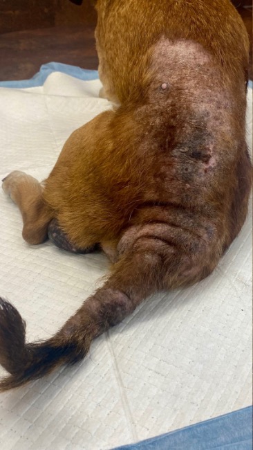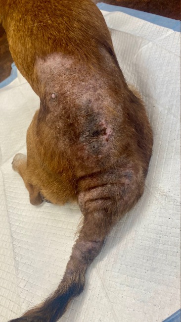 - Rozległe wyłysienia na plecach i ogonie, liczne strupy i zadrapania