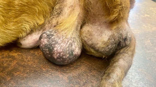 - Widoczna przepuklina około odbytnicza po stronie prawej