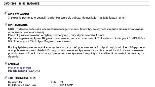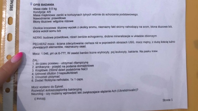 Bakteria okazała się na tyle złośliwa, że stopniowo uodparniała się na kolejne wprowadzane antybiotyki linco spectin, neomecynę. W badaniu USG w pęcherzu na początku wszystko się świeciło, ściana była silnie pogrubiona, hiperplazja błony śluzowej z licznymi wtrętami, kryształy. Obecnie jest nieco lepiej, ale wciąż zalega mnóstwo kryształów. Z powodu infekcji bakteryjnej pH jest wysokie, a przez to kryształy nie chcą się rozpuszczać.