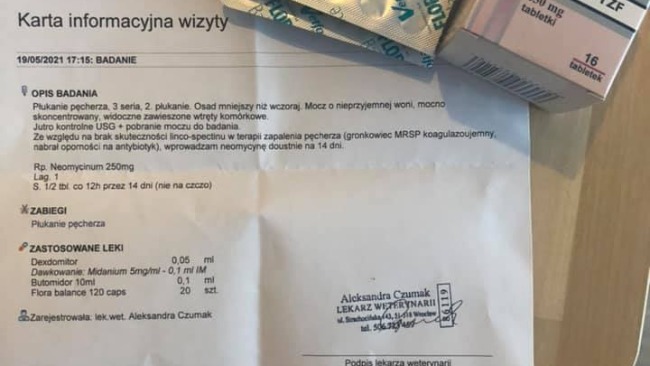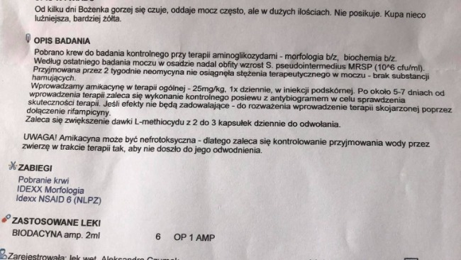 Obecne leczenie Bożenki: antybiotyk biodacyna, l-methiocid, urinovet, dzika róża, uro vaxom, flora balance, beta glukan.