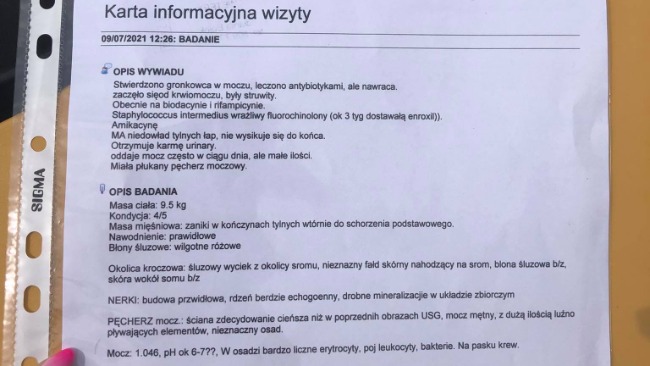 Po dzisiejszej konsultacji z lekarzem będziemy do biodacyny dołączać drugi antybiotyk - rifampicynę. Poprzednie zakwaszacze zamienimy na urinoloxan i urinomet, pozostałe preparaty zostają jak były. Bożka przejdzie w przyszłym tygodniu jeszcze dwukrotne płukanie pęcherza, a my mamy włączyć karmę z serii urinary. Niestety duży wpływ na brak pozytywnej reakcji na podjęte leczenie mogą mieć problemy neurologiczne. Bożka ma niedowład tylnych łap, a co za tym idzie nie odsikuje się do końca.