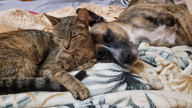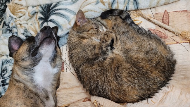 Tutaj na zdjęciach Tekilka ze swoim psim bratem i kompanem, który nieraz uratował ją dając nam znak, że ma właśnie ataki padaczki. Hienek bo tak ma na imię piesiu, sam został znaleziony w lesie w górach i przygarnięty przez nas 🐕 Nasza kochana znajdka 🤎 Oprócz psa Tekilka ma jeszcze trzech kocich adoptowanych towarzyszy 🐈🤍🩶🖤