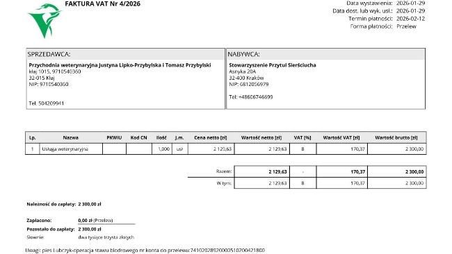 Każda, nawet najmniejsza kwota, będzie dla nas wielkim wsparciem. Samo opłacenie chirurga i naprawa ze strony ortopedycznej oraz jego kastracja to koszt 2300 zł. Gdyby udało nam się spłacić choć ten dług będziemy ogromnie wdzięczni.