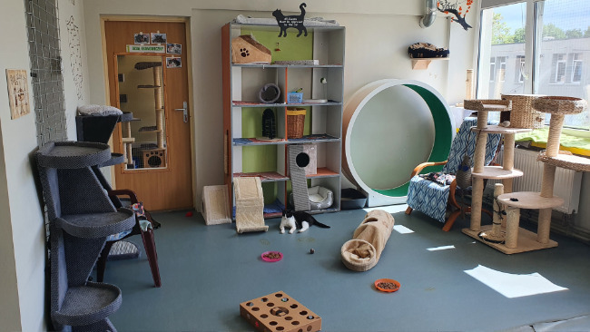 Jeden pokój zajmuje kwarantanna - pomieszczenia z klatkami, w których przez dwa tygodnie muszą mieszkać koty nowo przybyłe do fundacji. Doglądamy ich stanu, leczymy i gdy upewnimy się, że są zdrowe - dołączamy do pozostałych mruczków.