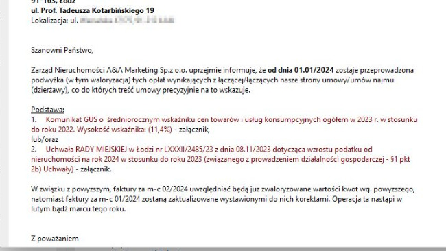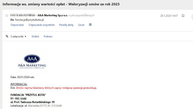 Pomieszczenia Mruczarni są wynajmowane i co miesiąc płacimy czynsz, który systematycznie wzrasta. Z końcem stycznia przenieśliśmy kwarantannę do Mruczarni, by zwolnić i zdać jedno wynajmowane pomieszczenie. Gdy już ucieszyliśmy się z zaoszczędzonych kilkuset złotych, otrzymaliśmy poniższą wiadomość. Chociaż mamy do dyspozycji mniej przestrzeni - obawiamy się, czy łączna kwota do zapłaty nie będzie wyższa niż wcześniej...