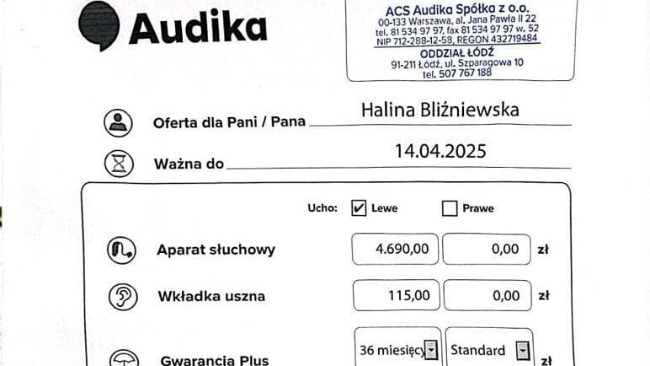 Lekarze zalecili zakup dwóch specjalistycznych aparatów słuchowych, ponieważ ubytek słuchu jest bardzo duży. Koszt jednego aparatu to 4 690,00 zł – niestety to kwota, która znacznie przekracza możliwości finansowe Pani Halinki.