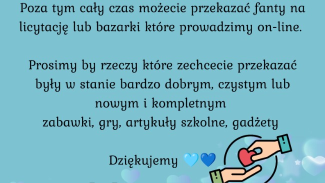 Jeśli macie ochotę to również możecie zorganizować zbiórki, kiermasz czy bazarek przyjmujemy też fanty na licytacje. Zapraszamy do kontaktu na naszym fanpage na Facebooku I Ty Możesz Pomóc Oskarowi 😘