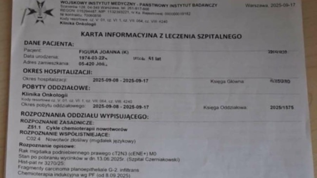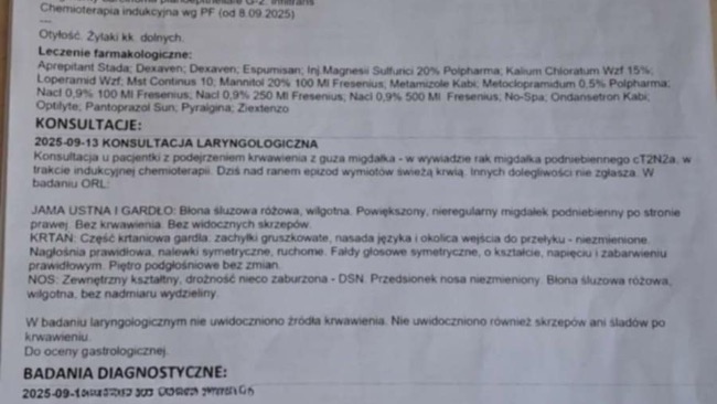 Mój stan zdrowia w ostatnim czasie znacząco się pogorszył. Jestem w trakcie leczenia onkologicznego, które bardzo mocno obciąża mój organizm. Po dotychczasowej radioterapii jestem wyraźnie osłabiona, mam gorsze wyniki badań i problemy z mówieniem. Organizm jest już częściowo wyniszczony terapią, co wpływa na moje codzienne funkcjonowanie.