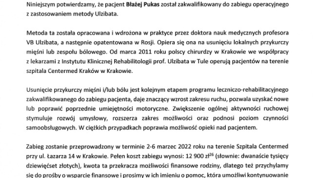 Błażej nie chodzi samodzielnie. Porusza się na czworaka lub jeździ na wózku inwalidzkim. Żeby pomóc stanąć mu na nogi potrzebny jest kosztowny zabieg zwany Metodą Ulzibata. Zaplanowany jest na 3 marca w Krakowie. Koszt to 12.900 zł. Wychowuje Błażeja sama i niestety nie stać mnie na sfinansowanie całej kwoty samodzielnie, dlatego prosimy o wsparcie.
