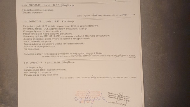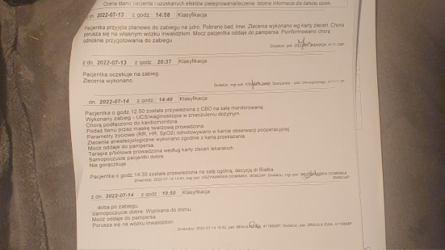 W 2016 roku na nowotwór złośliwy zmarła moja mama, bardzo to mną wstrząsnęło i zabrało nadzieje na wyjście z choroby, gdy już pogodziłam się już z tymi wydarzeniami w 2018 r. Tuż przed Świętami Bożego Narodzenia we własnym mieszkaniu przez niedowład nogi upadając złamałam kość udową . Wstawiono śruby, po roku bólu i poruszania się na wózku inwalidzkim prześwietlenie stwierdziło, że śruby migrują i trzeba je usunąć. Noga się nie zrosła, ból pozostał a pandemia wykluczyła mnie z dalszych operacji. Czas nie działał na moją korzyść, powstały przykurcze, zaniki mięśni i kości. Przez moją pierwotną chorobę i stan całego organizmu nie chciano podjąć się operacji endoplastyki stawu biodrowego w Otwocku.