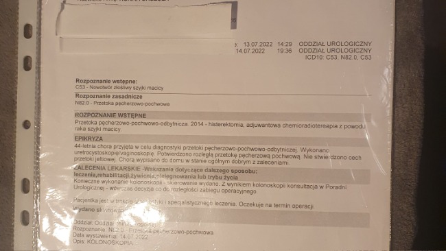 Dalsze leczenie w szczególności naświetlania wywołały skutki uboczne. Utraciłam pęcherz. Przez kolejne lata byłam w pieluchach, co bardzo wpłynęło na moją samoocenę i codzienne życie. Lekarze wykluczyli przeprowadzenie operacji pęcherza do czasu zakończenia leczenia nowotworowego.