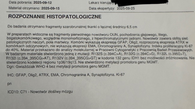 Mój syn, młody mężczyzna pełen marzeń i pasji — zwłaszcza do motocykli — pod koniec sierpnia 2025 roku zaczął odczuwać dziwne objawy: mrowienie twarzy i problemy ze wzrokiem. Myśleliśmy, że to zwykły problem z zatrzymaną ósemka naciskająca na nerw. Tymczasem 5 września dowiedzieliśmy się, że ma guza mózgu o wielkości 70x56x68 mm. Trzy tygodnie później, 3 października, usłyszeliśmy diagnozę, która złamała nam serca — glejak IV stopnia.