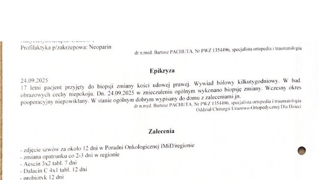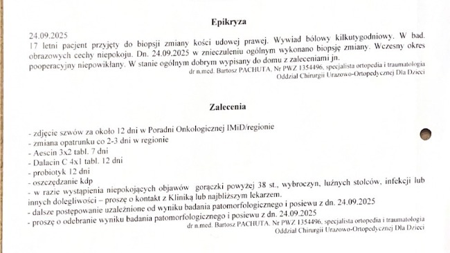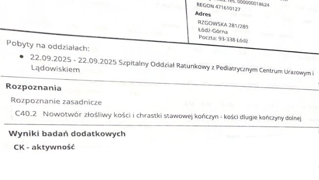 Diagnoza była jednoznaczna: złośliwy nowotwór kości – osteosarcoma kości udowej prawej (C40.2).