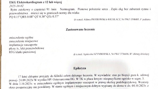 Na stronie zbiórki udostępnione są zanonimizowane dokumenty medyczne, potwierdzające diagnozę i aktualny stan leczenia.