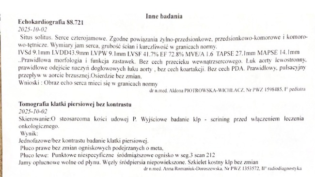 Po badaniach obrazowych oraz biopsji zmiany w kości udowej potwierdzono rozpoznanie osteosarcomy – agresywnego nowotworu kości.