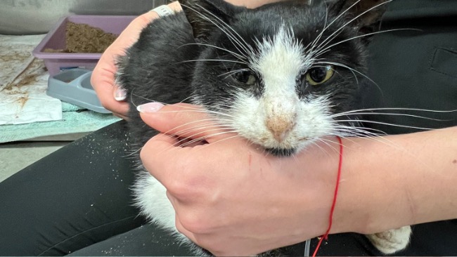 To dorosły kot… ważący niespełna 2 kg. Wyniszczony, skrajnie niedożywiony, z niewydolnością nerek. Niestety większość kotów z huty ma te same problemy — chore nerki i brak odporności.