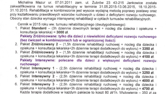 W październiku czeka nas kolejny turnus rehabilitacyjny w Michałkowie. Część funduszy mamy uzbierane (1500 pcpr, 1000 fundacja), lecz nadal brakuje nam 2500 złotych. Pakiet niezbędny nam to intensywny 3 (do kosztu turnusu dochodzi 840 zł wyzywienia). Bardzo prosimy o wsparcie i możliwość wyjazdu na turnusu, aby Michasia mogła się rozwijać.
