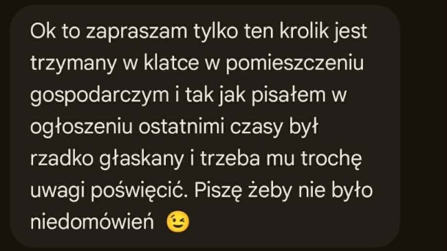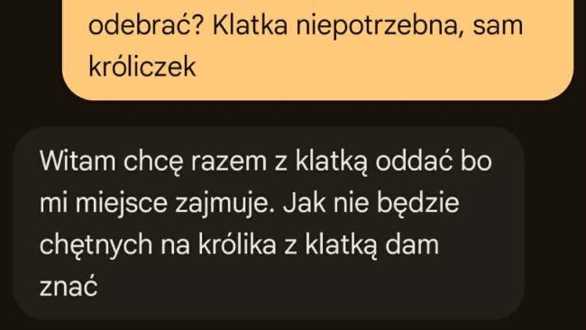 To ogłoszenie znalazłyśmy same, ale zostało nam też podsyłane, pojawiało się także na lokalnych grupach. Masakryczne warunki, królik trzymany w jakiejś szopie, bez możliwości wyjścia z niej, siedzący w swoich odchodach, jedzący owies, a wodę (o ile ją ma) w zielonym, gnijącym poidle.