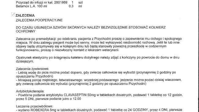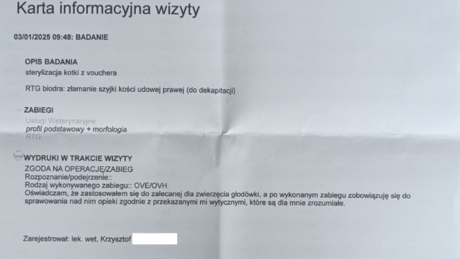 Chciałam ją odpchlić, odrobaczyć, zaszczepić i wykastrować, a następnie znaleźć kochający dom. W tym celu poprosiłam o pomoc Fundację "Oleśnickie Bidy". Fundacja zgodziła się pomóc i opłaciła wszystkie wymienione wyżej zabiegi. Poniżej dla potwierdzenia wpisy z książeczki zdrowia: