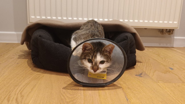 W międzyczasie zauważyłam jednak, że Pola delikatnie kuleje na tylną prawą łapę. A podczas głaskania wyczułam, że kości w okolicach biodra są niesymetryczne, z jednej strony bardziej wystają. Dlatego też, przy okazji zabiegu kastracji, by nie poddawać kotki niepotrzebnie dwukrotnie narkozie, zostało przeprowadzone RTG biodra. Wykazało ono, że Pola ma złamaną szyjkę kości udowej. Być może w przeszłości uległa jakiemuś wypadkowi, bądź ktoś ją kopnął. Tego nie wiem...