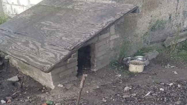 Łańcuch maksymalnie 1,5 m , coś co było jej budą , to kilka cegiel przykrytych dechami ,a w środku goły beton. Ta niby buda ,tak "duża" , że Lenka musiała się tam wczołgiwać i mocno postarać , żeby się w niej zmieścić.